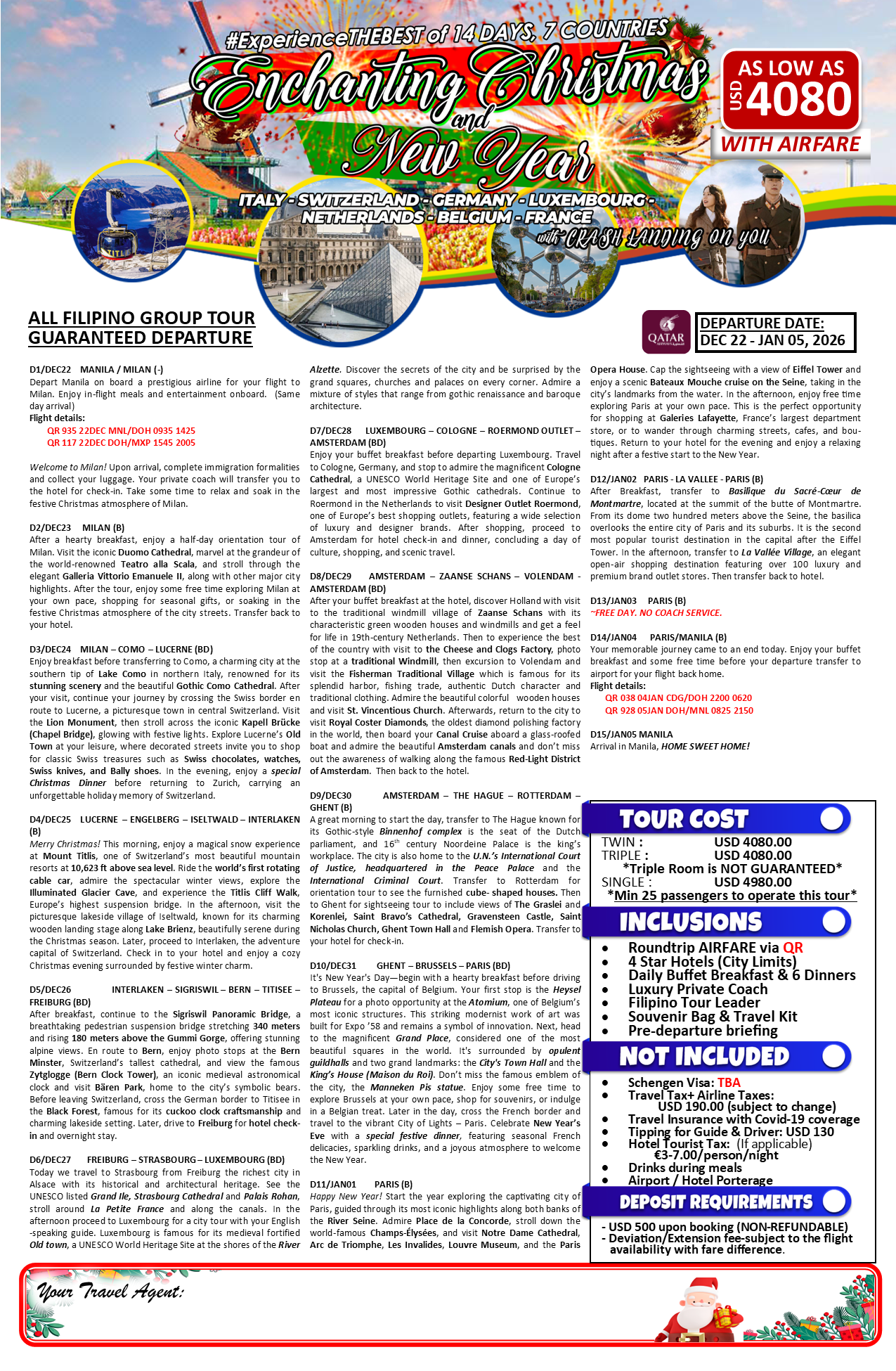 14d/13n CHRISTMAS & NEW YEAR ENCHANTING EUROPE 2026! If you are interested to join this tour, please fill in your details below: ← BackThank you for your interest! A member of our team will get in touch with you. Name:(required) Email Address:(required) Mobile Number:(required) SendSubmitting form Δ