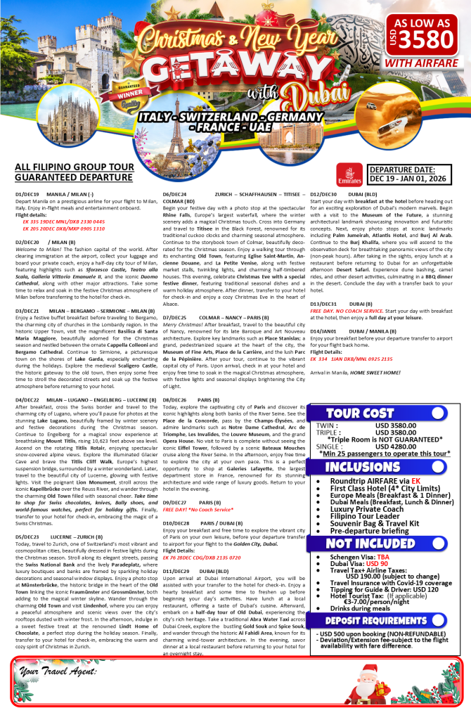 14d/13n Christmas & New Year Getaway with Dubai 2026 If you are interested to join this tour, please fill in your details below: ← BackThank you for your interest! A member of our team will get in touch with you. Name(required) Email Address(required) Mobile Number(required) SendSubmitting form Δ