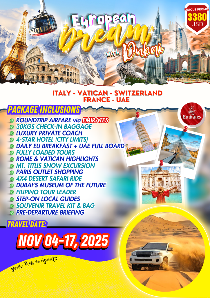 14d/13n EUROPEAN DREAM with DUBAI TOUR 2025 If you are interested to join this tour, please fill in your details below: Go backThank you for your interest! A member of our team will get in touch with you. Name(required) Warning Email Address(required) Warning Mobile Number(required) Warning Warning. SendSubmitting form Δ