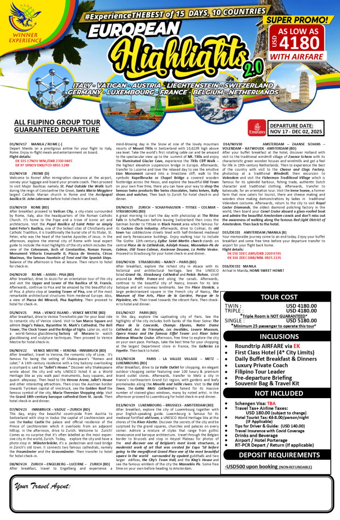 15d/14n EUROPEAN HIGHLIGHTS TOUR 2.0 |NOV 2025| If you are interested to join this tour, please fill in your details below: Go backThank you for your interest! A member of our team will get in touch with you. Name(required) Warning Email Address(required) Warning Mobile Number(required) Warning Warning. SendSubmitting form Δ