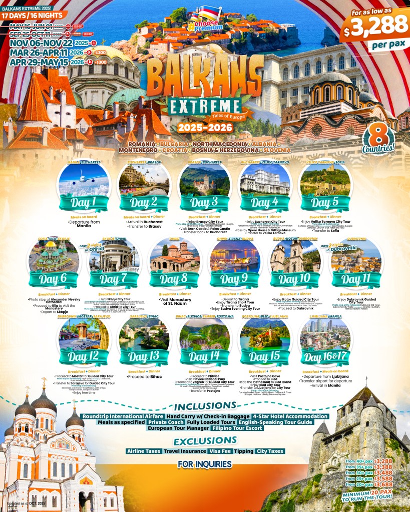 17d/16n Balkans Extreme 2025 – 2026 If you are interested to join this tour, please fill in your details below: Go backThank you for your interest! A member of our team will get in touch with you. Name(required) Warning Email Address(required) Warning Mobile Number(required) Warning Warning. SendSubmitting form Δ