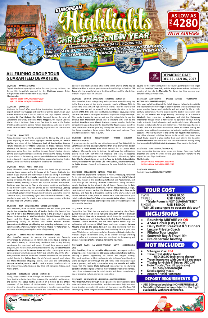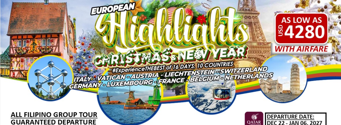 16d/15n EUROPEAN HIGHLIGHTS CHRISTMAS & NEW YEAR |DEC-JAN 2026-2027| If you are interested to join this tour, please fill in your details below: ← BackThank you for your interest! A member of our team will get in touch with you. Name(required) Email Address(required) Mobile Number(required) SendSubmitting form Δ