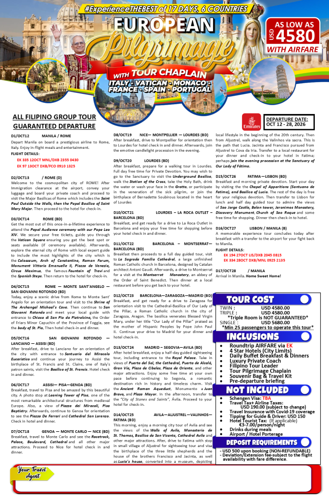 17d/16n EUROPEAN PILGRIMAGE WITH TOUR CHAPLAIN OCT 2026 If you are interested to join this tour, please fill in your details below: â BackThank you for your interest! A member of our team will get in touch with you. Name(required) Email Address(required) Mobile Number(required) SendSubmitting form Δ