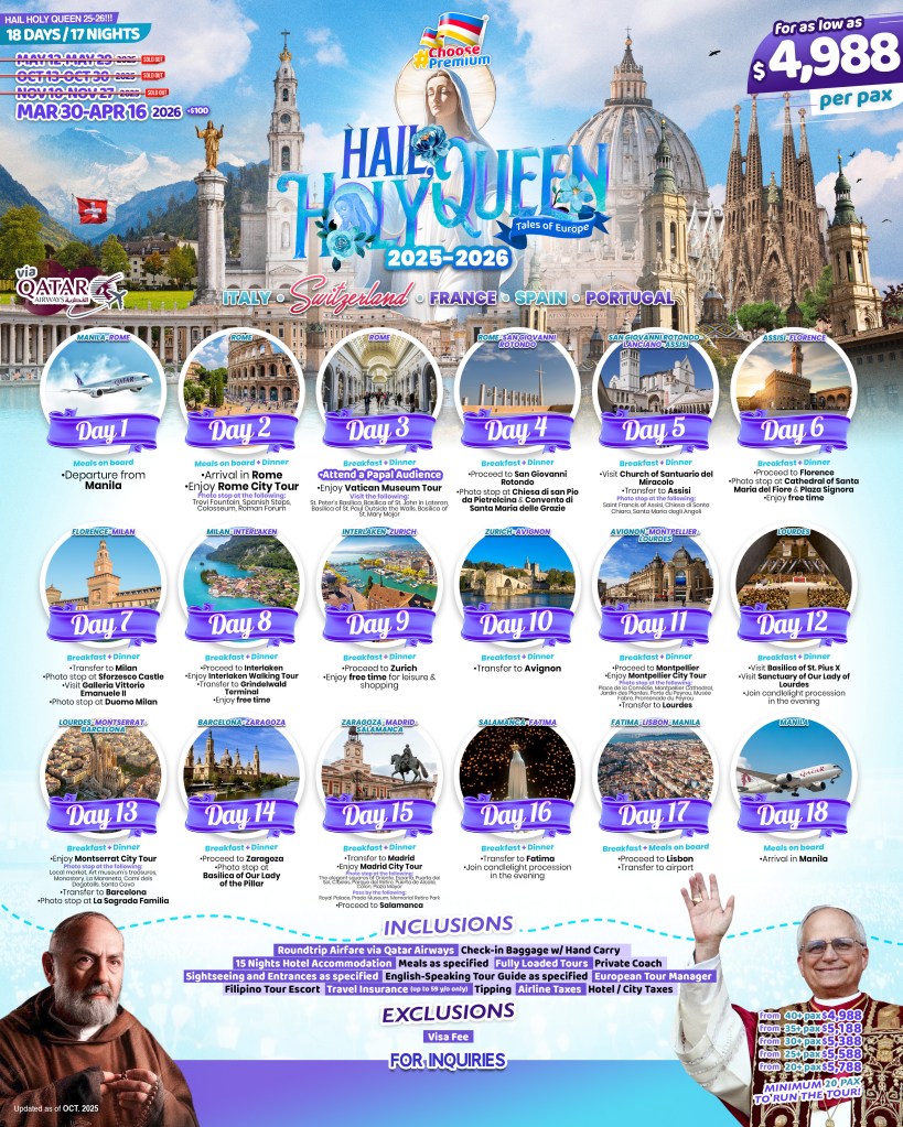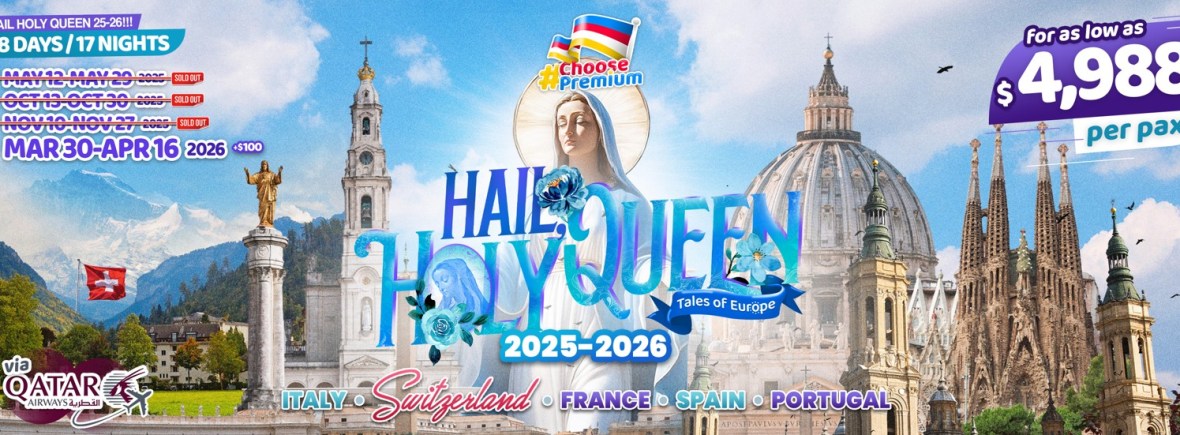 18d/17n HAIL, HOLY QUEEN 2026 If you are interested to join this tour, please fill in your details below: ← BackThank you for your interest! A member of our team will get in touch with you. Name:(required) Email Address:(required) Mobile Number:(required) SendSubmitting form Δ