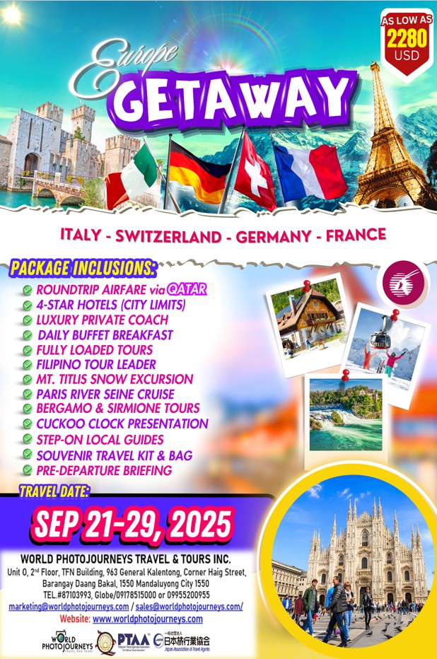9d/8n EUROPE GETAWAY 2025! If you are interested to join this tour, please fill in your details below: Go backThank you for your interest! A member of our team will get in touch with you. Name:(required) Warning Email Address:(required) Warning Mobile Number:(required) Warning Warning. SendSubmitting form Δ