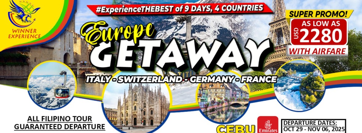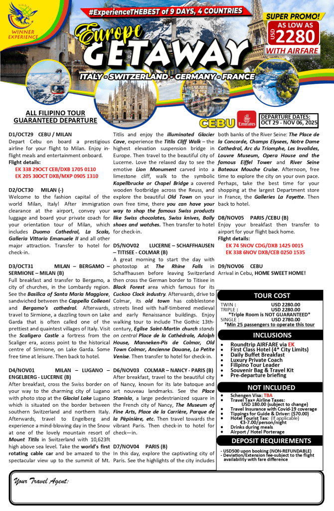 9d/8n EUROPE GETAWAY CEBU via Emirates |Oct-Nov 2025| If you are interested to join this tour, please fill in your details below: Go backThank you for your interest! A member of our team will get in touch with you. Name(required) Warning Email Address(required) Warning Mobile Number(required) Warning Warning. SendSubmitting form Δ
