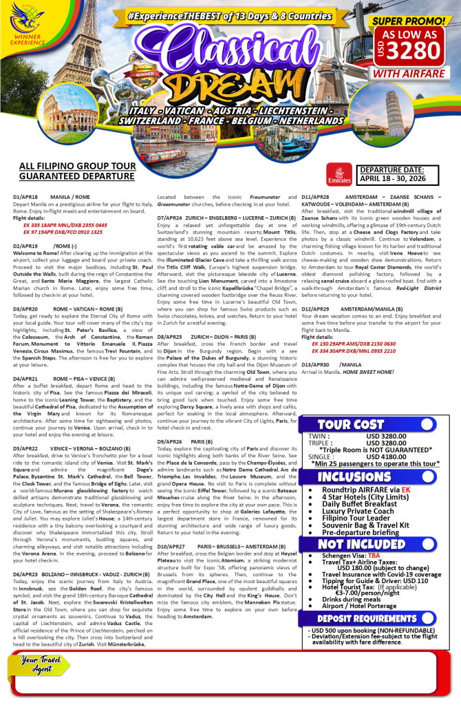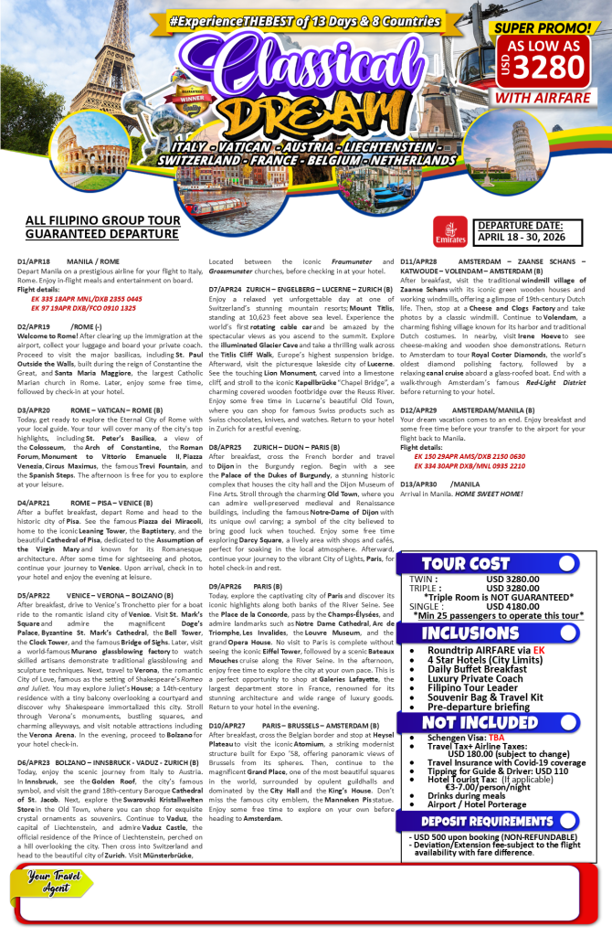 12d/11n EUROPEAN CLASSICS TOUR |APR 2026| If you are interested to join this tour, please fill in your details below: ← BackThank you for your interest! A member of our team will get in touch with you. Name(required) Email Address(required) Mobile Number(required) SendSubmitting form Δ