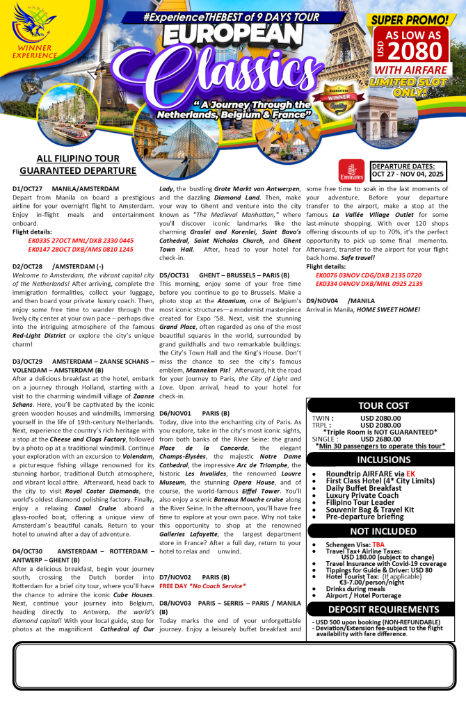 9d/8n EUROPEAN CLASSICS TOUR |OCT-NOV 2025| If you are interested to this tour, please fill in your details below: Go backThank you for your interest! A member of our team will get in touch with you. Name(required) Warning Email Address(required) Warning Mobile Number(required) Warning Warning. SendSubmitting form Δ