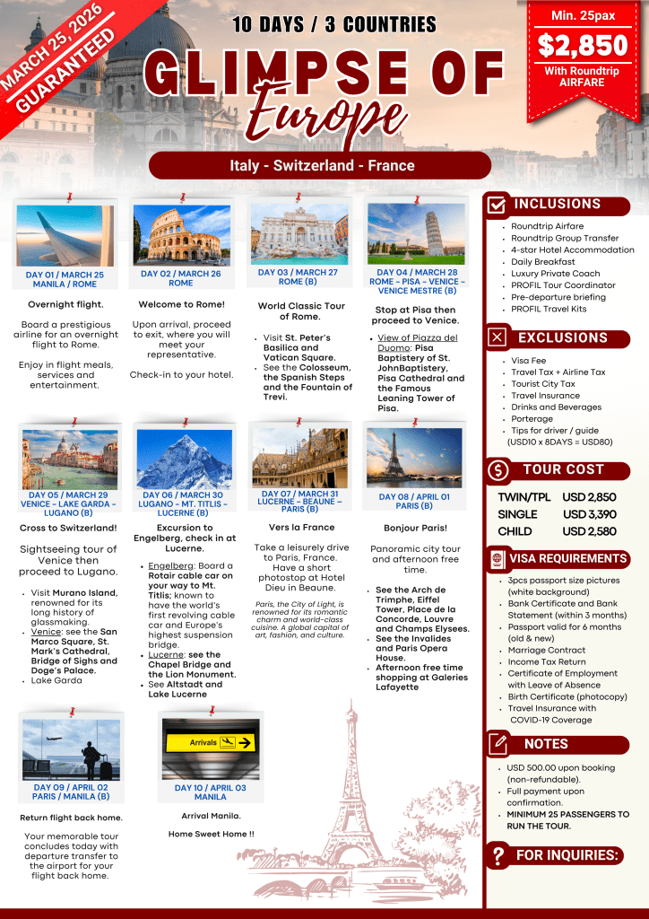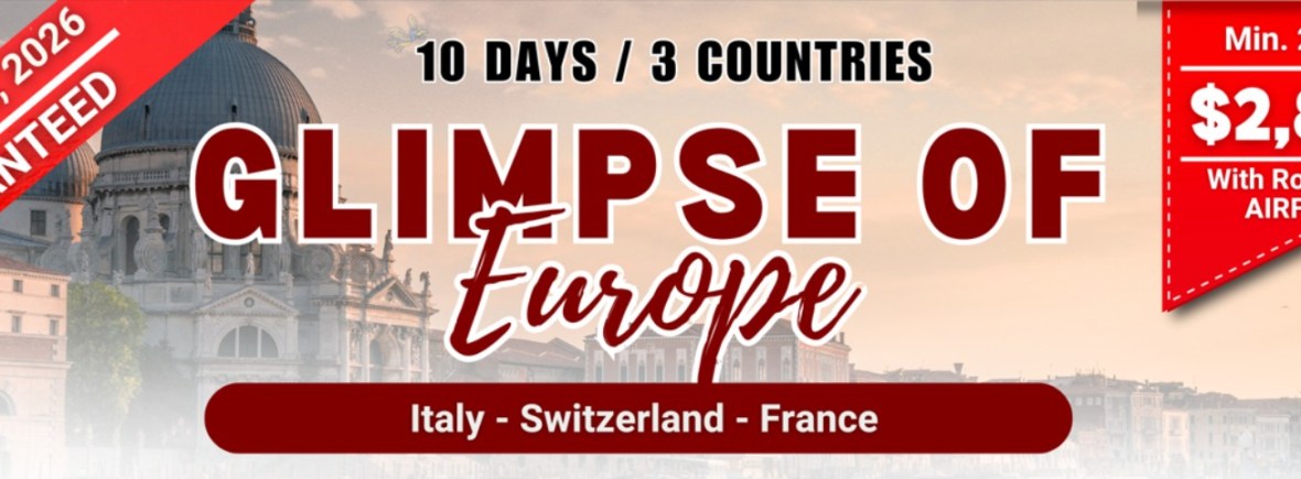 [GUARANTEED] GLIMPSE OF EUROPE | MAR 2026 If you are interested to join this tour, please fill in your details below: ← BackThank you for your interest! A member of our team will get in touch with you. Name(required) Email Address(required) Mobile Number(required) SendSubmitting form Δ