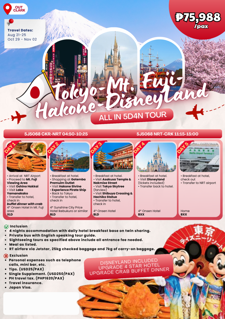 5d/4n ALL IN TOUR 2025!! Tokyo-Mt. Fuji-Halcone-Disneyland If you are interested to join this tour, please fill in your details below: Go backThank you for your interest! A member of our team will get in touch with you. Name(required) Warning Email Address(required) Warning Mobile Number(required) Warning Warning. SendSubmitting form Δ