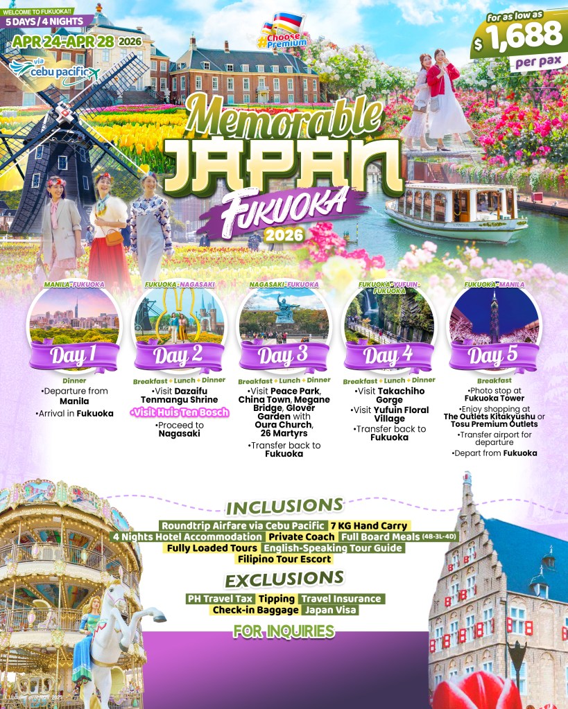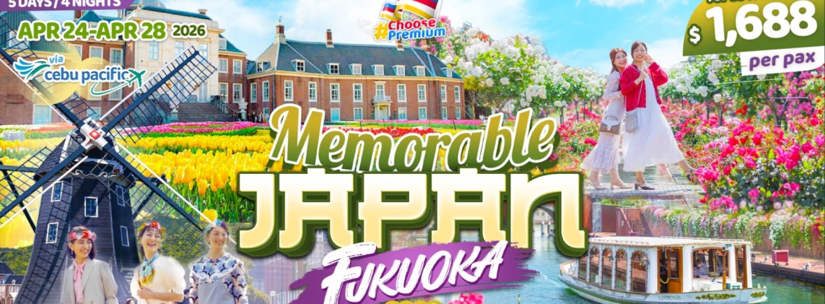 5d/4n Memorable Japan in FUKUOKA 2026 (Welcome to FUKUOKA!!) If you are interested to join this tour, please fill in your details below: ← BackThank you for your interest! A member of our team will get in touch with you. Name:(required) Email Address:(required) Mobile Number:(required) SendSubmitting form Δ
