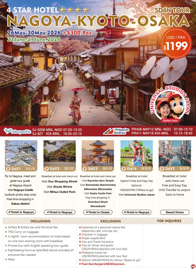 5d/4n NAGOYA-KYOTO-OSAKA TOUR 2026 If you are interested to join this tour, please fill in your details below: ← BackThank you for your interest! A member of our team will get in touch with you. Name(required) Email Address(required) Mobile Number(required) SendSubmitting form Δ