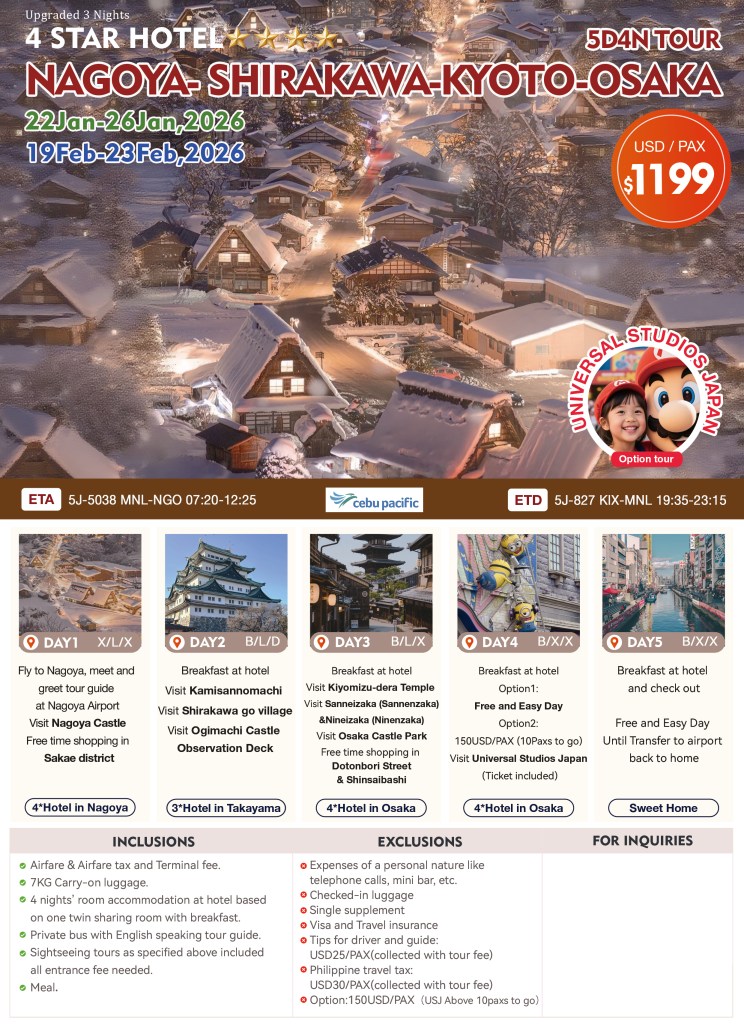 5d/4n NAGOYA-SHIRAKAWA-KYOTO-OSAKA TOUR 2026 If you are interested to join this tour, please fill in your details below: ← BackThank you for your interest! A member of our team will get in touch with you. Name(required) Warning Email Address(required) Warning Mobile Number(required) Warning Warning. SendSubmitting form Δ