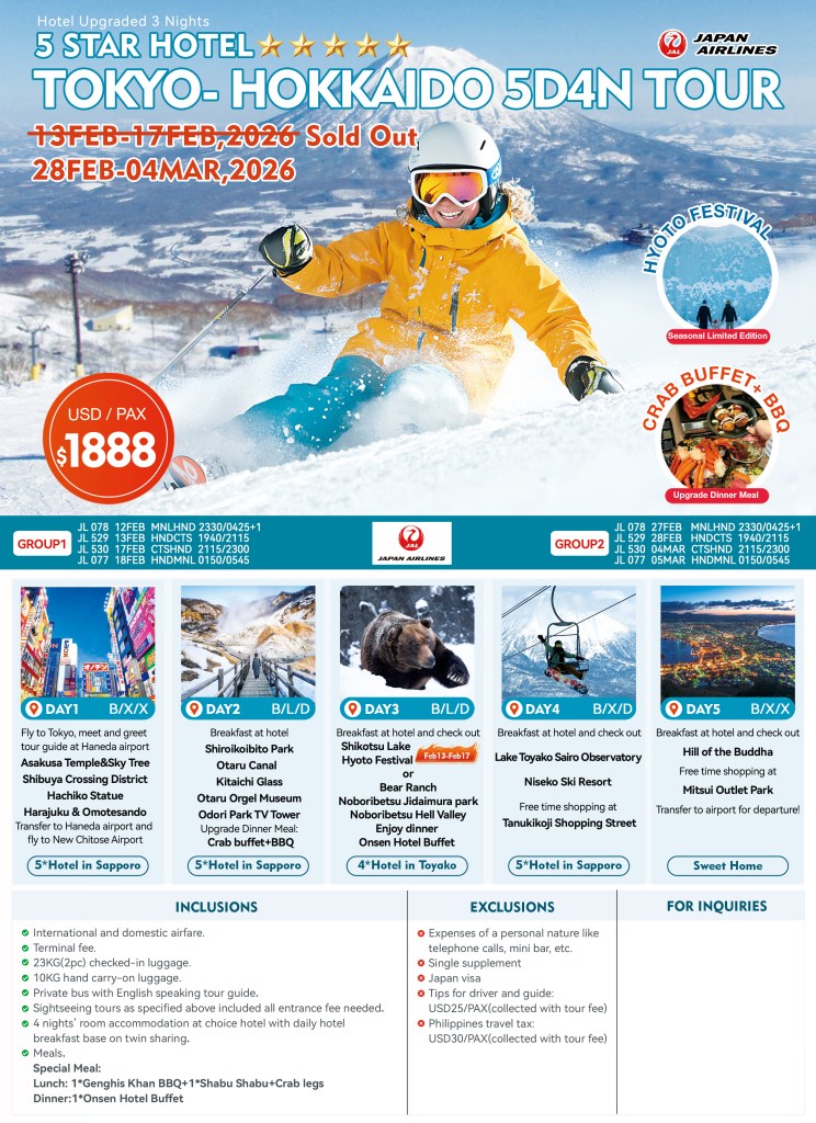 5d/4n Tokyo – Hokkaido TOUR 2026 If you are interested to join this tour, please fill in your details below: ← BackThank you for your interest! A member of our team will get in touch with you. Name:(required) Email Address:(required) Mobile Number:(required) SendSubmitting form Δ