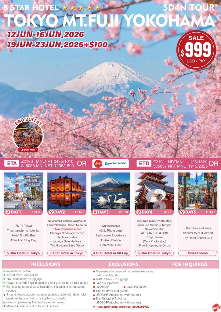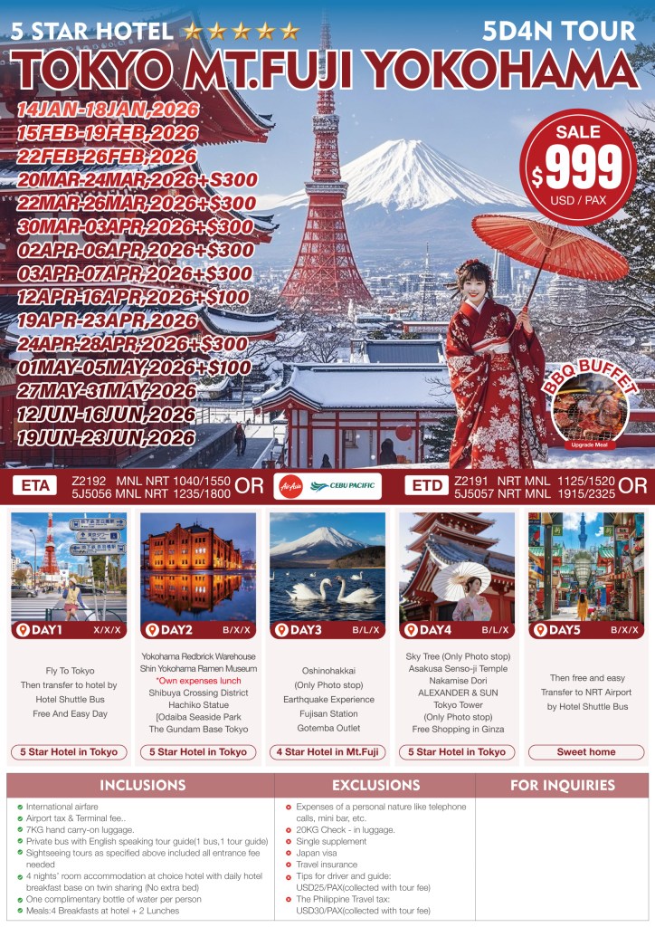 5d/4n TOKYO-MT.FUJI-YOKOHAMA 2026 If you are interested in join this tour, please fill in your details below: ← BackThank you for your interest! A member of our team will get in touch with you. Name:(required) Email Address:(required) Mobile Number:(required) SendSubmitting form Δ