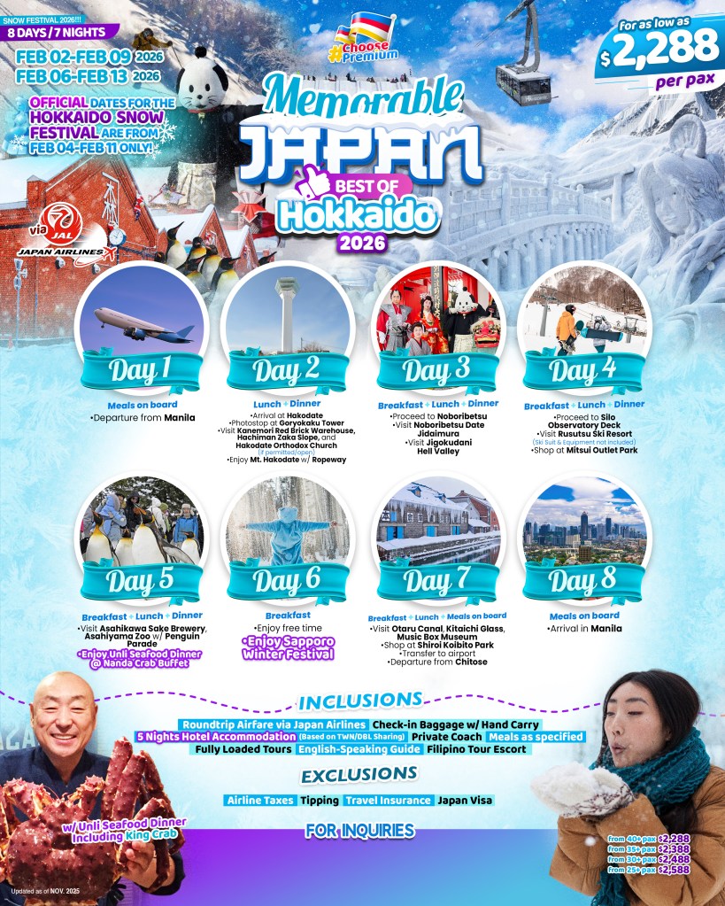 8d/7n Snow Festival Memorable Japan Best of Hokkaido 2026 If you are interested to join this tour, please fill in your details below: ← BackThank you for your interest! A member of our team will get in touch with you. Name(required) Email Address(required) Mobile Number(required) SendSubmitting form Δ