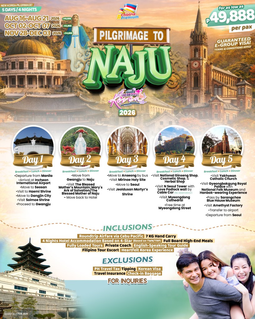 5d/4n Korea Pilgrimage to Naju If you are interested to join this tour, please fill in your details below: ← BackThank you for your interest! A member of our team will get in touch with you. Name:(required) Email Address:(required) Mobile Number:(required) SendSubmitting form Δ