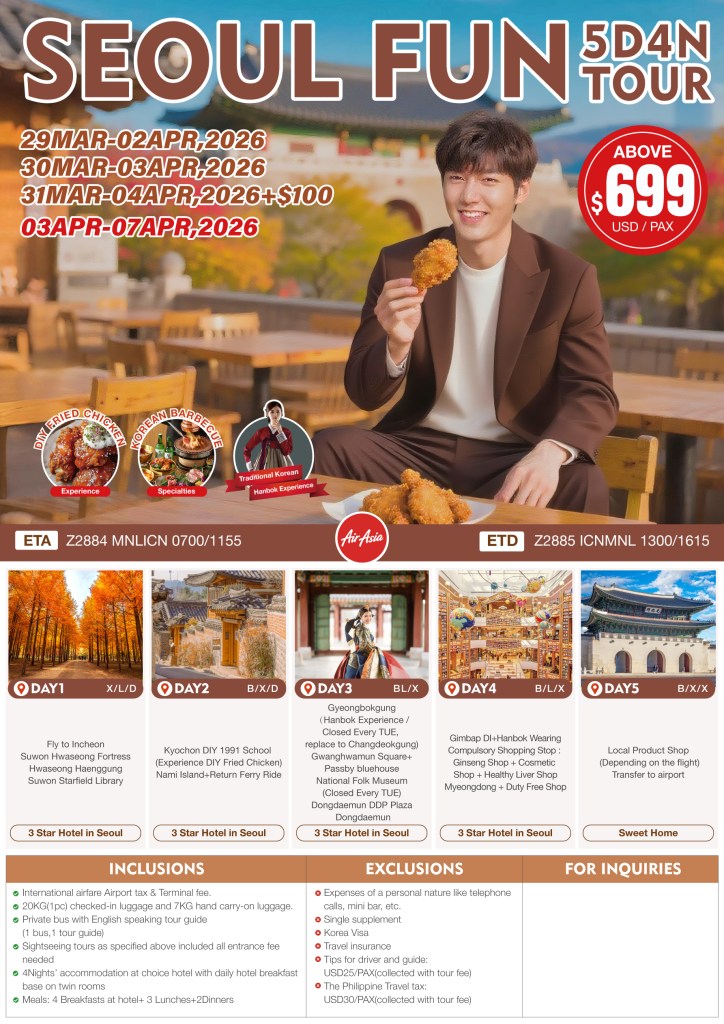5d/4n SEOUL FUN TOUR 2026 If you are interested to join this tour, please fill in your details below: ← BackThank you for your interest! A member of our team will get in touch with you. Name:(required) Email Address:(required) Mobile Number:(required) SendSubmitting form Δ