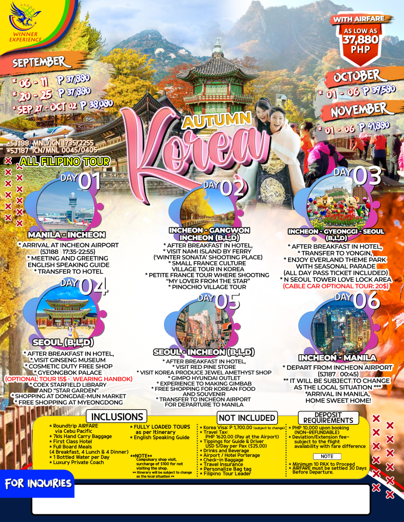 6d/5n AUTUMN KOREA TOUR 2025 |SEP-NOV| If you are interested to join this tour, please fill in your details below: Go backThank you for your interest! A member of our team will get in touch with you. Name(required) Warning Email Address(required) Warning Mobile Number(required) Warning Warning. SendSubmitting form Δ
