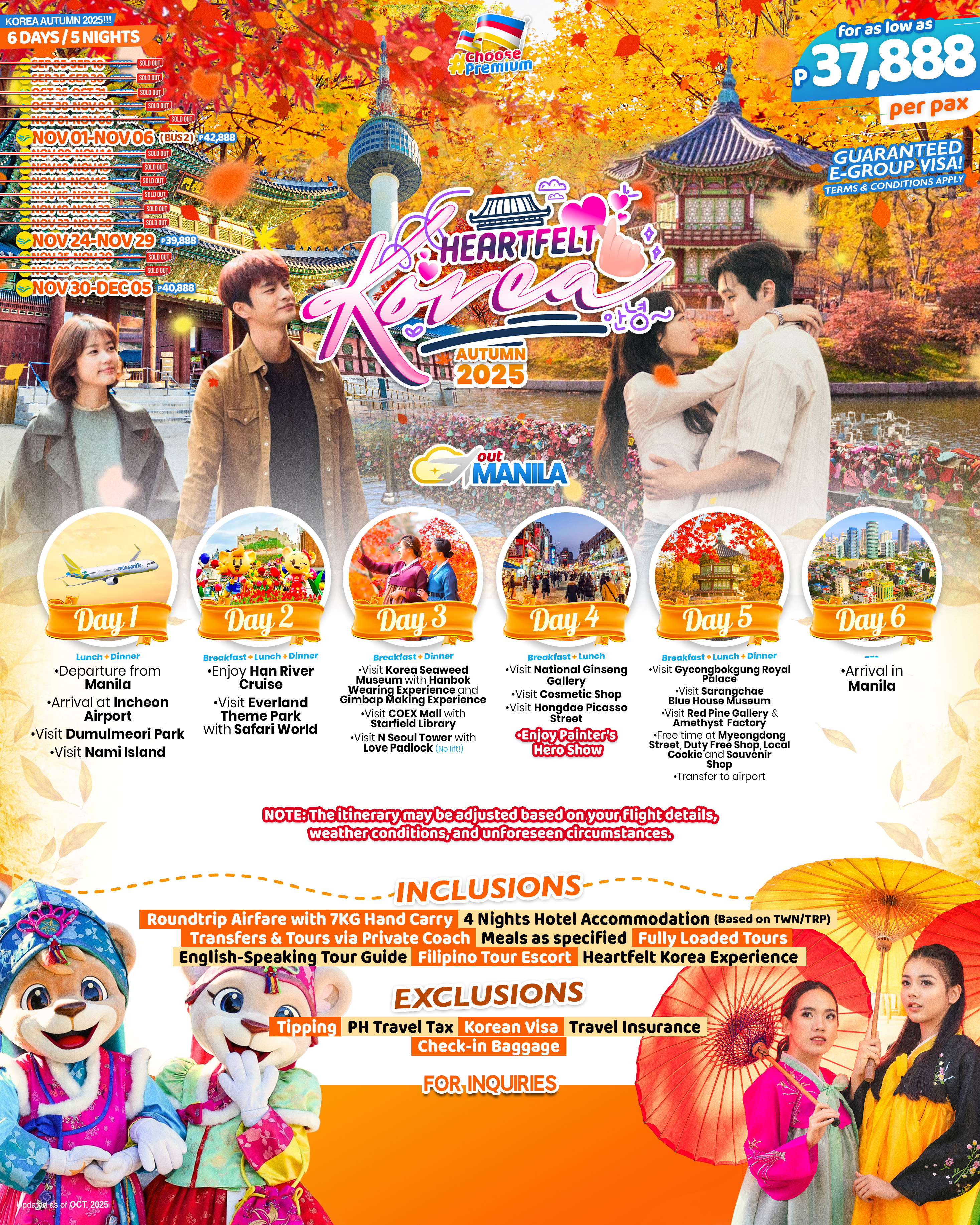 6d/5n HEARTFELT KOREA – AUTUMN 2025 If you would like to join this tour, kindly provide your details in the form below: Go backThank you for your interest! A member of our team will get in touch with you. Name:(required) Warning Email Address:(required) Warning Mobile Number:(required) Warning Warning. SendSubmitting form Δ