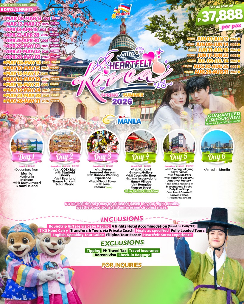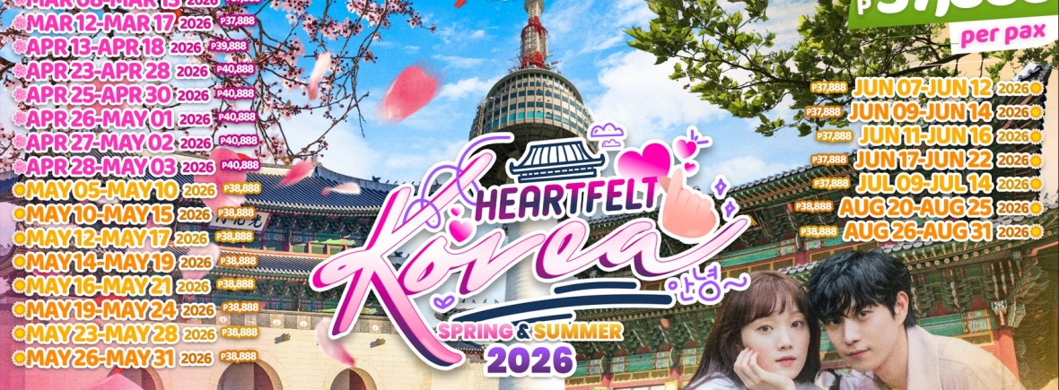 6d/5n HEARTFELT KOREA SPRING-SUMMER 2026! If you are interested to join this tour, please fill in your details below: ← BackThank you for your interest! A member of our team will get in touch with you. Name:(required) Email Address:(required) Mobile Number:(required) SendSubmitting form Δ
