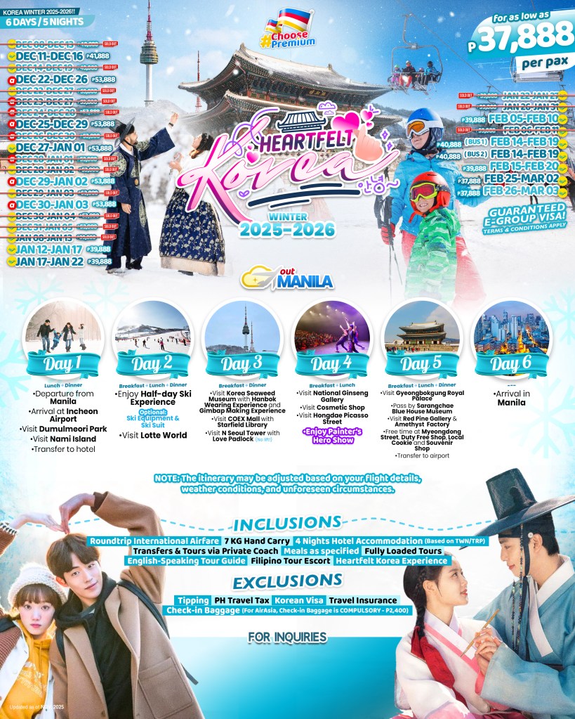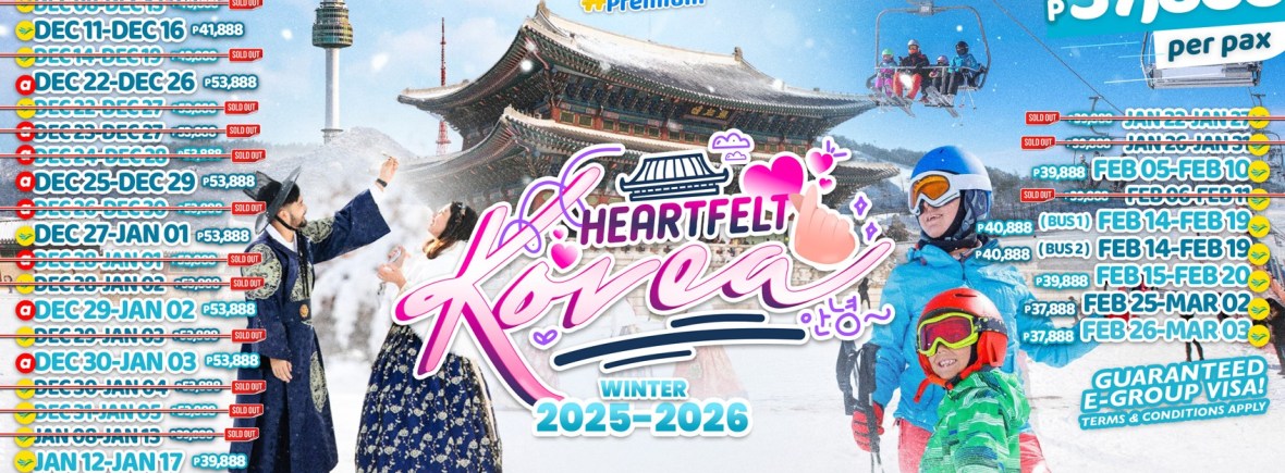 6d/5n HEARTFELT KOREA WINTER 2026!! If you would like to join this tour, kindly provide your details in the form below: ← BackThank you for your interest! A member of our team will get in touch with you. Name:(required) Email Address:(required) Mobile Number:(required) SendSubmitting form Δ
