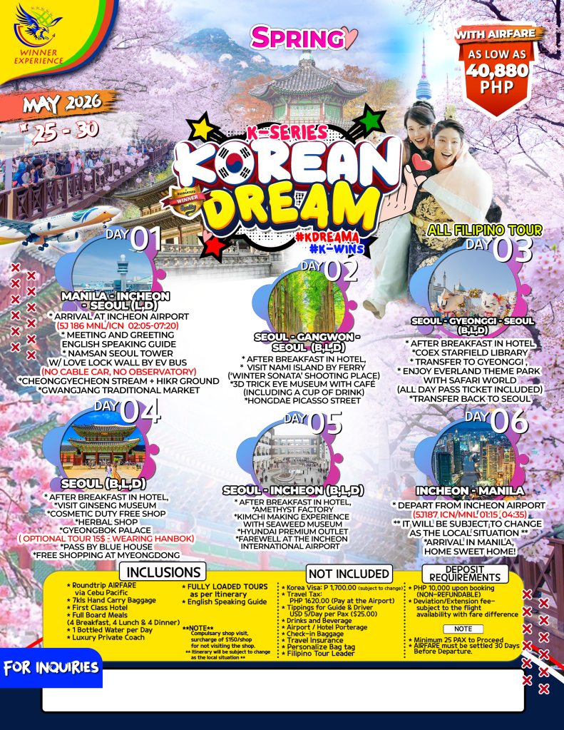 6d/5n Spring K-Series Korean Dream MAY 2026 If you are interested to join this tour, please fill in your details below: ← BackThank you for your interest! A member of our team will get in touch with you. Name:(required) Email Address:(required) Mobile Number:(required) SendSubmitting form Δ