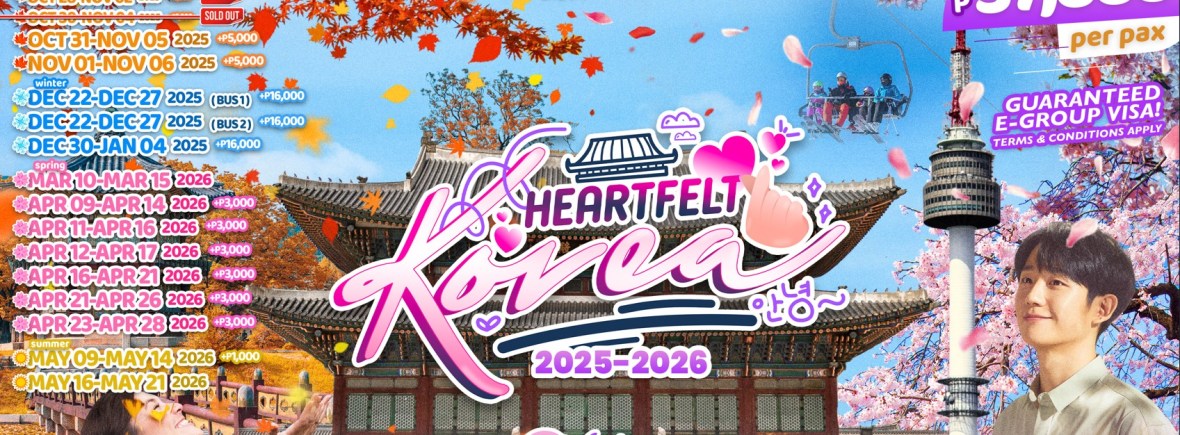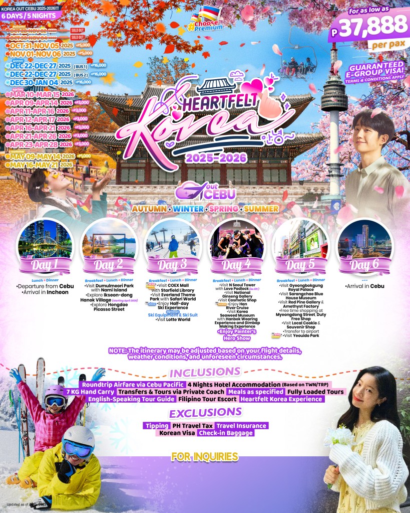 6d/5n HEARTFELT KOREA OUT CEBU TOUR 2025-2026!! If you are interested to join this tour, please fill in your details below: Go backThank you for your interest! A member of our team will get in touch with you. Name(required) Warning Email Address(required) Warning Mobile Number(required) Warning Warning. SendSubmitting form Δ