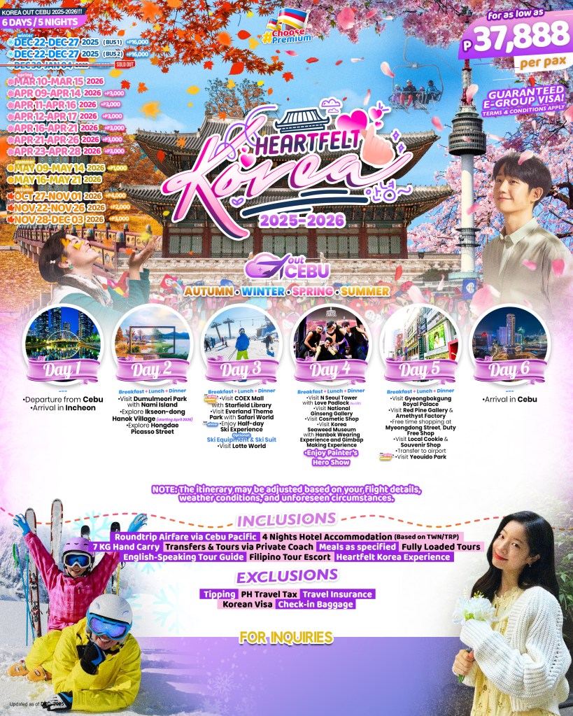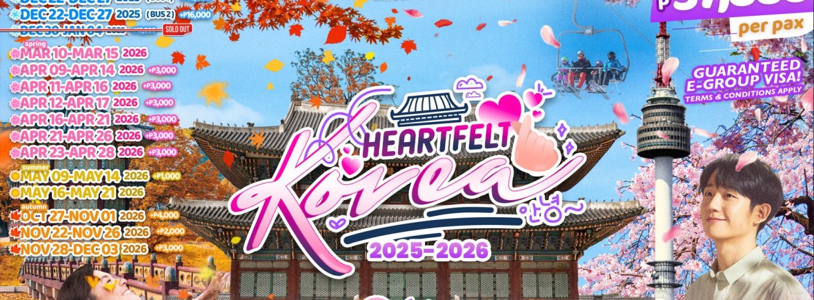 6d/5n HEARTFELT KOREA OUT CEBU TOUR 2025-2026!! If you are interested to join this tour, please fill in your details below: ← BackThank you for your interest! A member of our team will get in touch with you. Name(required) Email Address(required) Mobile Number(required) SendSubmitting form Δ