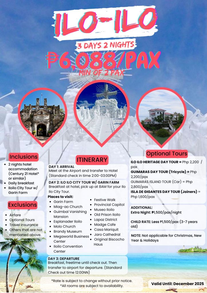 3d/2n ILO-ILO TOUR 2025 If you are interested to join this tour, please fill in your details below: Go backYour message has been sent Name(required) Warning Email(required) Warning Phone Warning How did you hear about us? Select one option Search engine Social media TV Radio Friend or family Warning Other details Warning Warning. SendSubmitting form Δ