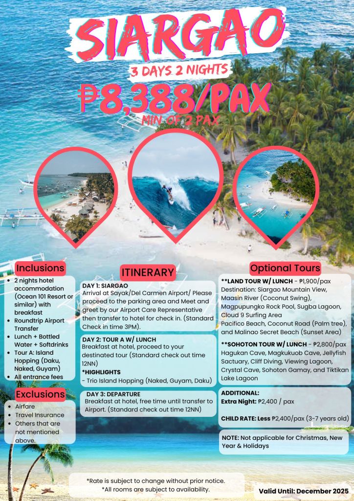 3d/2n SIARGAO TOUR 2025 If you are interested to join this tour, please fill in your details below: ← BackThank you for your response. ✨ Name(required) Email(required) Phone How did you hear about us? Select one option Search engine Social media TV Radio Friend or family Other details SendSubmitting form Δ