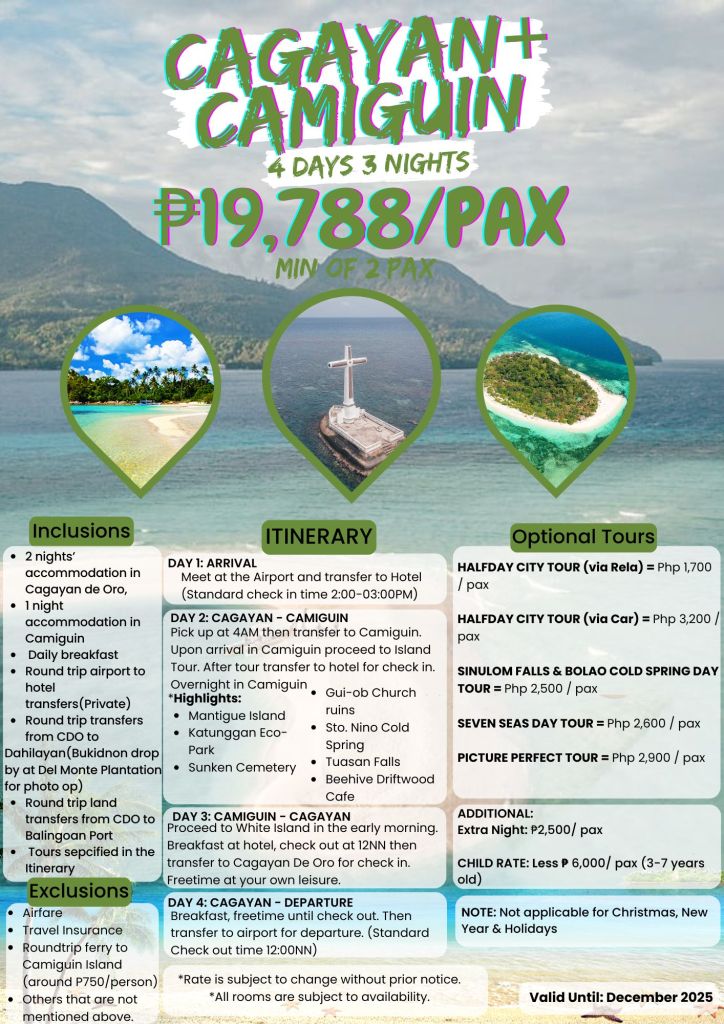 4d/3n CAGAYAN + CAMIGUIN TOUR 2025 If you are interested to join this tour, please fill in your details below: ← BackThank you for your response. ✨ Name(required) Email(required) Phone SendSubmitting form Δ