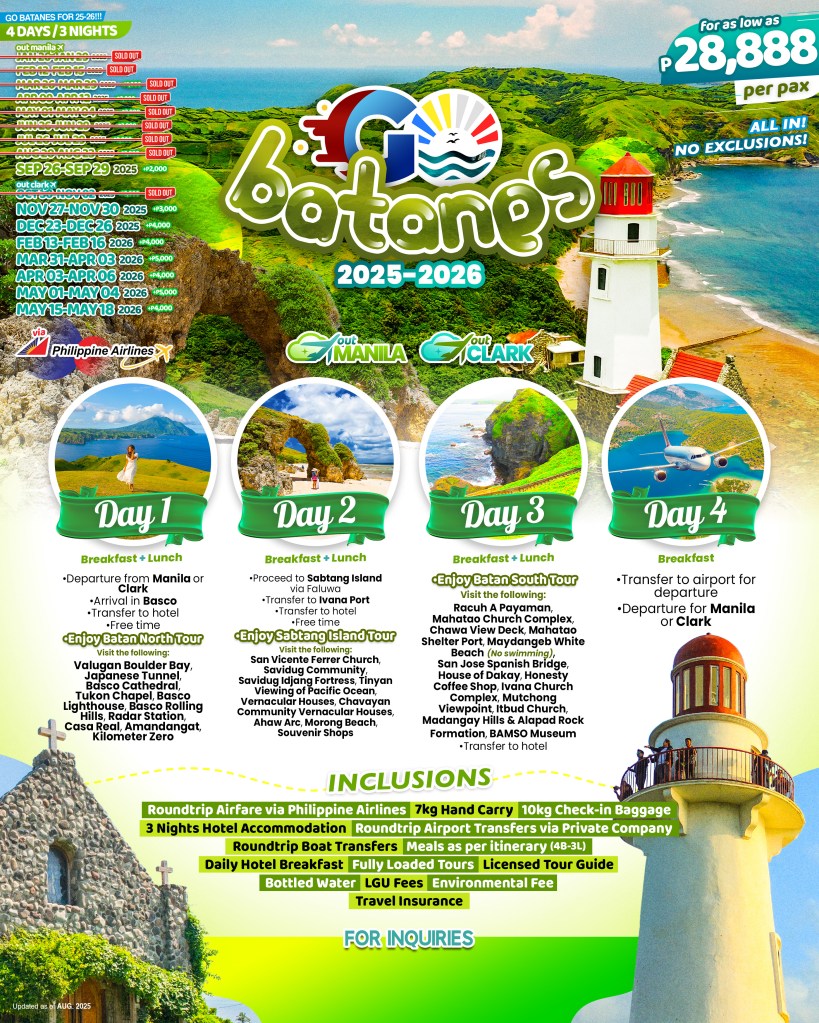 4d/3n GO BATANES TOUR for 2025-2026 EPSON MFP image If you are interested to join this tour, please fill in your details below: Go backThank you for your interest! A member of our team will get in touch with you. Name:(required) Warning Email Address:(required) Warning Mobile Number:(required) Warning Warning. SendSubmitting form Δ
