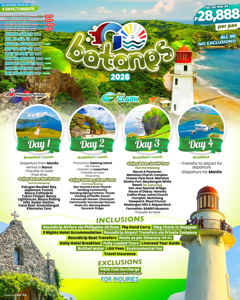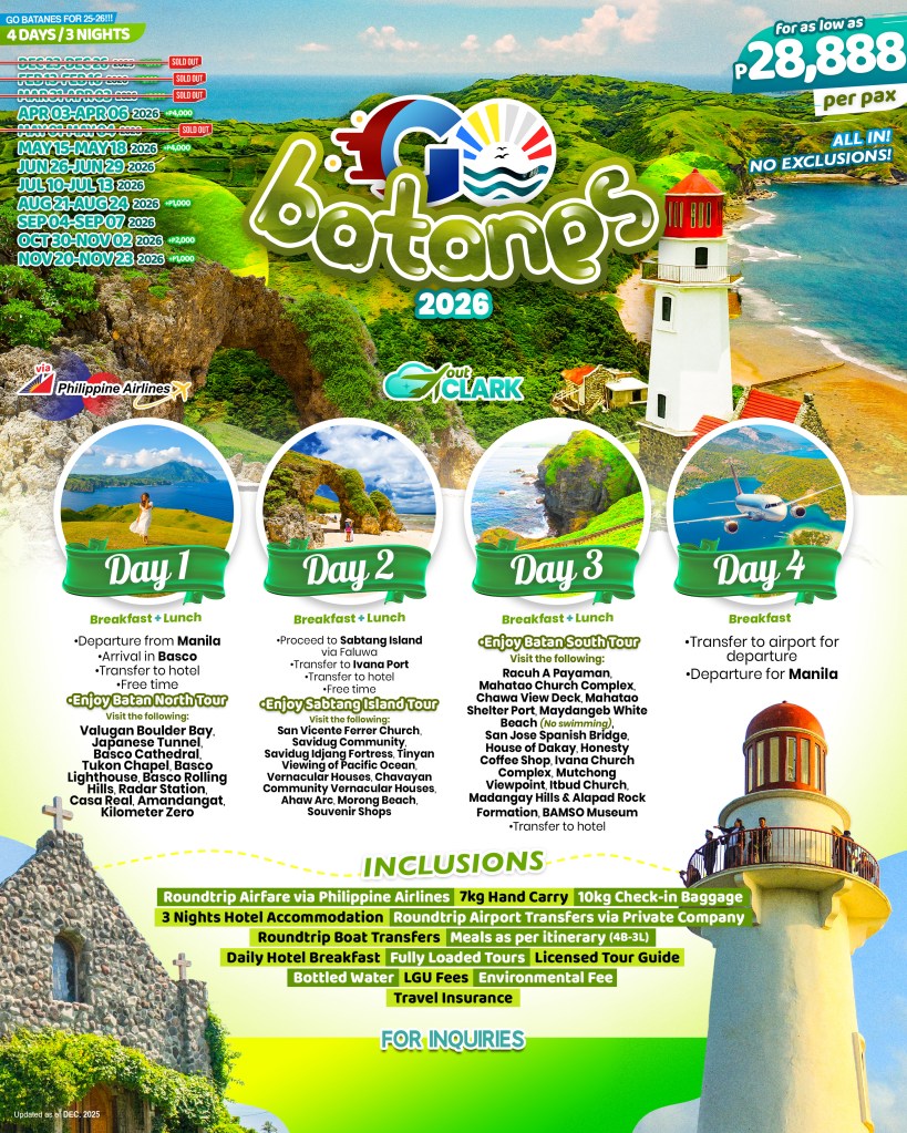 4d/3n GO BATANES TOUR for 2026 If you are interested to join this tour, please fill in your details below: ← BackThank you for your interest! A member of our team will get in touch with you. Name:(required) Email Address:(required) Mobile Number:(required) SendSubmitting form Δ