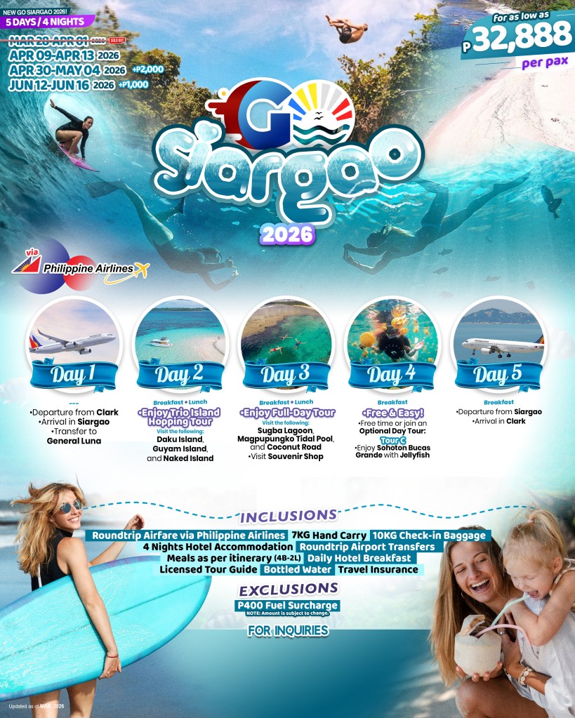 5d/4n GO SIARGAO TOUR 2026 If you are interested to join this tour, please fill in your details below: ← BackThank you for your interest! A member of our team will get in touch with you. Name:(required) Email Address:(required) Mobile Number:(required) SendSubmitting form Δ