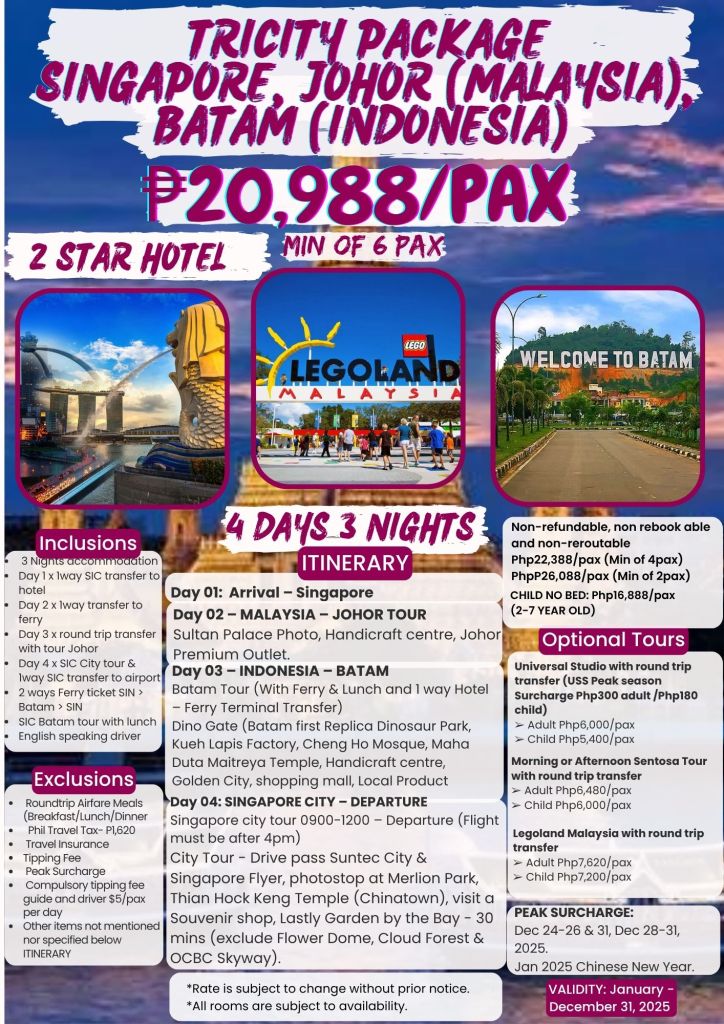 4d/3n TRICITY PACKAGE TOUR 2025 SINGAPORE, JOHOR (MALAYSIA), BATAM (INDONESIA) If you are interested to join this tour, please fill in your details below: ← BackThank you for your response. ✨ Name(required) Email(required) Phone Message SendSubmitting form Δ