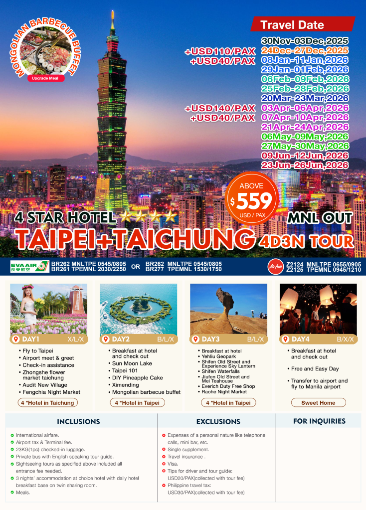 4d/3n TAIPEI + TAICHUNG TOUR 2025 – 2026 If you are interested to join this tour, please fill in your details below: Go backThank you for your interest! A member of our team will get in touch with you. Name:(required) Warning Email Address:(required) Warning Mobile Number:(required) Warning Warning. SendSubmitting form Δ