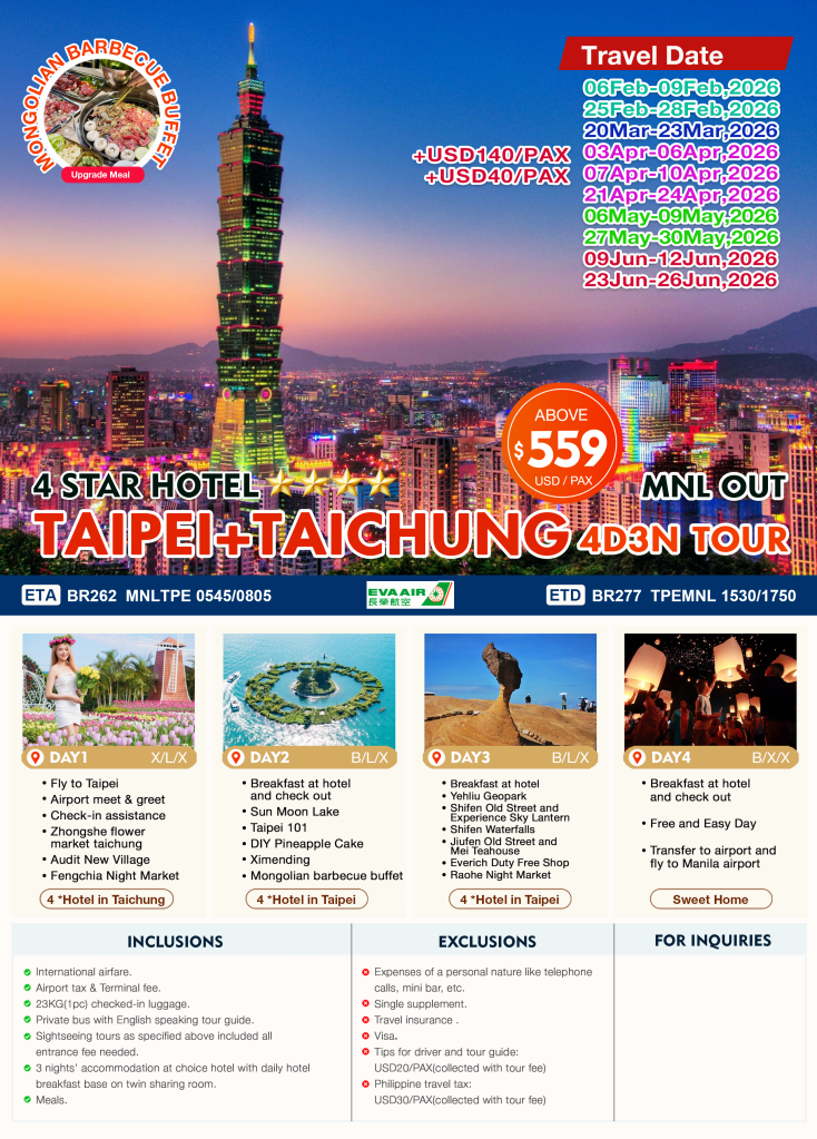 4d/3n TAIPEI + TAICHUNG TOUR 2026 If you are interested to join this tour, please fill in your details below: ← BackThank you for your interest! A member of our team will get in touch with you. Name:(required) Warning Email Address:(required) Warning Mobile Number:(required) Warning Warning. SendSubmitting form Δ