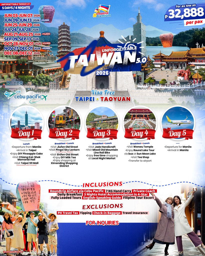5d/4n UNFORGETTABLE TAIWAN 5.0 TOUR 2026 If you are interested to join this tour, please fill in your details below; ← BackThank you for your interest! A member of our team will get in touch with you. Name(required) Warning Email Address(required) Warning Mobile Number(required) Warning Warning. SendSubmitting form Δ