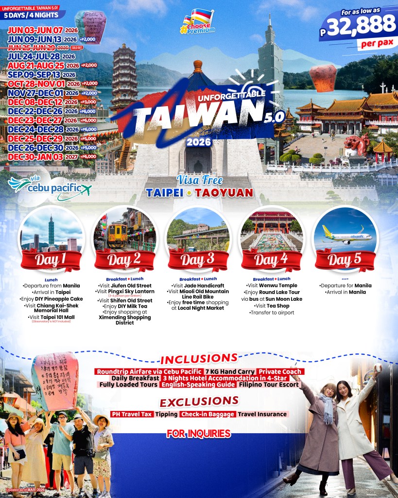 5d/4n UNFORGETTABLE TAIWAN 5.0 TOUR 2026 If you are interested to join this tour, please fill in your details below; ← BackThank you for your interest! A member of our team will get in touch with you. Name(required) Email Address(required) Mobile Number(required) SendSubmitting form Δ