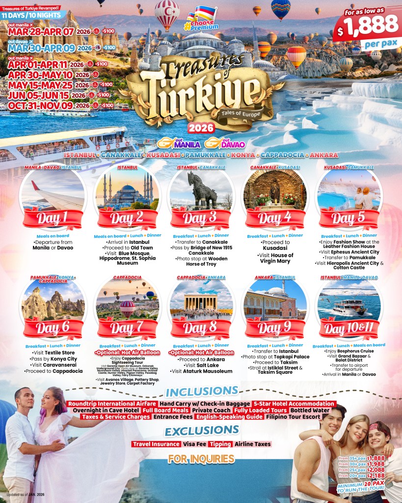 11d/10n TREASURES OF TURKIYE TOUR 2026 If you are interested to join this tour, please fill in your details below: ← BackThank you for your interest! A member of our team will get in touch with you. Name:(required) Email Address:(required) Mobile Number:(required) SendSubmitting form Δ