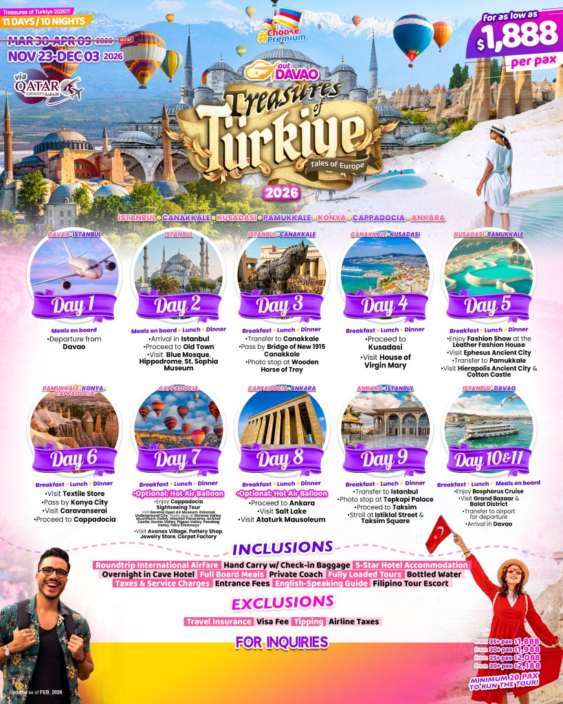 11d/10n TREASURES of TURKIYE (OUT DAVAO) 2026 If you are interested to join this tour, please fill in your details below: ← BackThank you for your interest! A member of our team will get in touch with you. Name(required) Email Address(required) Mobile Number(required) SendSubmitting form Δ