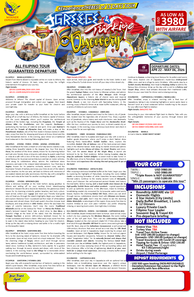 15d/14n GREECE & TURKIYE DISCOVERY |APR-MAY 2026| If you are interested to join this tour, please fill in your details below: ← BackThank you for your interest! A member of our team will get in touch with you. Name(required) Email Address(required) Mobile Number(required) SendSubmitting form Δ